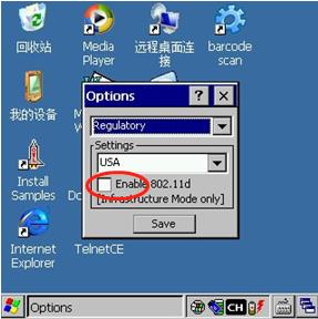 2、點(diǎn)擊上圖彈出菜單中的“Options”,在彈出的窗口中上部下拉框中選擇“Regulatory”,然后將下面“Settings”中“Enable 802.11d”前面的勾去掉,注意,這個(gè)選項(xiàng)經(jīng)我試驗(yàn)必須將勾去掉,因?yàn)閲?guó)內(nèi)的無(wú)線網(wǎng)一般是802.11g,按理說(shuō)這個(gè)802.11d選中應(yīng)該沒(méi)事的,但選中它時(shí),無(wú)線網(wǎng)就連不上!設(shè)置后應(yīng)該是下圖的樣子: