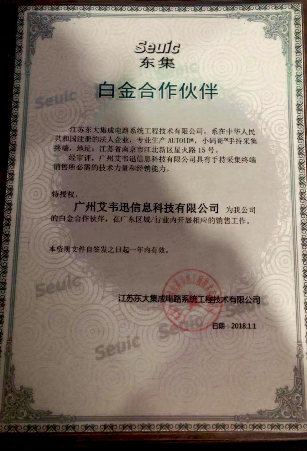 廣州艾韋迅信息科技有限公司于2018年1月接到江蘇東大集成電路系統工程技術有限公司通知,授予公司2018年度白金業務合作伙伴證書。