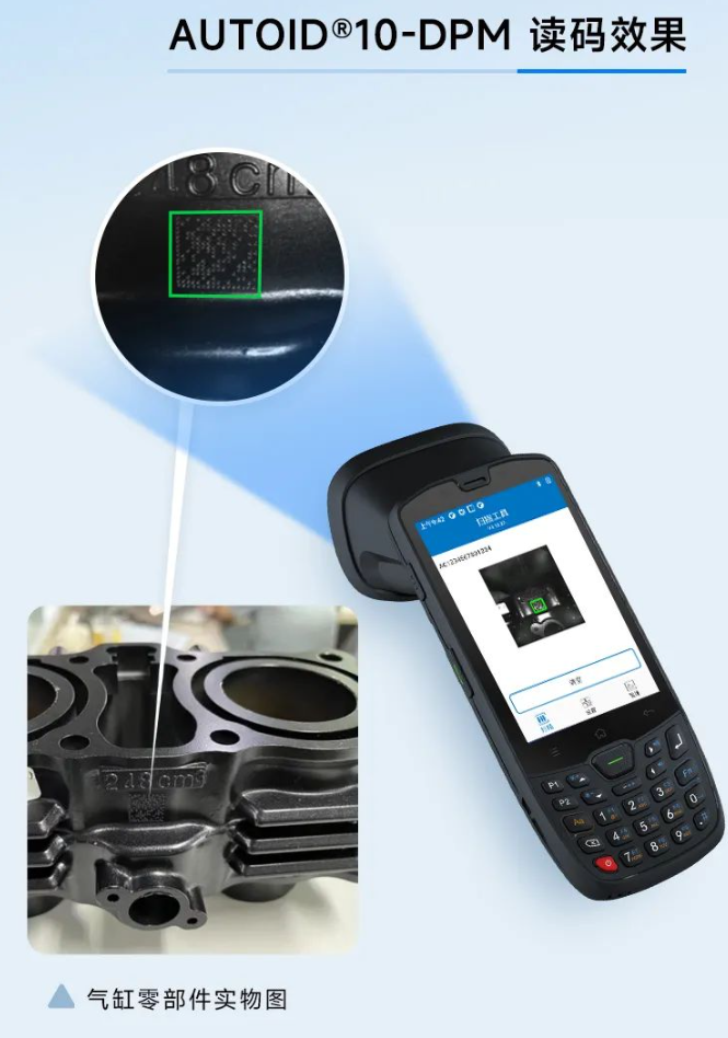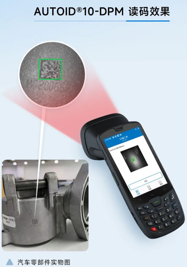 面對低比度低、強反光、曲面、微小尺寸、紋理干擾等復雜DPM碼,東集推出專屬DPM碼識別終端——AUTOID10-DPM,通過專業DPM掃描引擎+DPM算法+多色智能補光等多項技術,有效減少反光、優化圖像質量,達到高效識別99.9%DPM碼的良好識別效果。